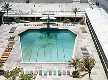 Lansky then hired Albert B. Parvin of Los Angeles to design the hotel's original decor. Parvin was an interior decorator whose only previous chief claim to fame in decorating was having laid carpets in many of the big hotels in Vegas. His main occupation was operating the Flamingo, a post he held between 1955 and 1960; nine years after Lansky himself agreed to Lucky Luciano's demands that a hit be put out on the casino's would-be original operator, Bugsy Siegal at the infamous Havana Conference.[4] Lansky also hired two of Cuba’s great artists, muralist Rolando Lopez Dirube and sculptor Florencio Gelabert, who designed the white marble sculptures of an intertwined mermaid and swordfish that fronts the entrance porte cochere, and "Ritmo Cubano" (Cuban Rhythm), a large lobby sculpture that depicts twirling male and female dancers rendered in bronze. Between them, the three men deftly captured the marine outdoor atmosphere.[5]