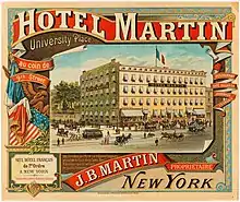 A late 1880s advertisement for the Martin described it as "the only first-class French hotel in New York." In addition to the artists and writers of Greenwich Village, the Martin's clients over the years included the opera singers Jean and Édouard de Reszke, Pol Plançon and Nelly Melba as well as the painter Théobald Chartran, the violinist Eugène Ysaÿe, and the French statesman Jules Cambon.[1]