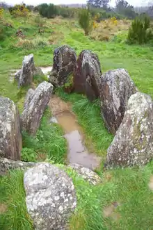 This is one of the rare funerary coffers under a tumulus in a region where tombs of the same period usually have covered passages.[7] It was excavated in 1982–1983.[8] The tumulus that covered the coffer was made up of small stones held in place by slabs, 0.8 metres (2.6 ft) to 1.6 metres (5.2 ft) long, driven diagonally at an angle of 45°[9] about 15 centimetres (6 in) into the ground.[7] The actual coffer is surrounded by 12 red schist slabs delimiting a funerary chamber 2.9 metres (9.5 ft) long by 1.5 to 1.6 metres (4.9 to 5.2 ft) wide[10] and not exceeding 1.4 metres (4.6 ft) high.[11] It must have been covered by other slabs which have since disappeared,[9] having been destroyed by treasure hunters.[3]