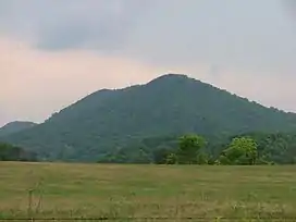 Geologically, House Mountain is a "synclinal outlier" of Clinch Mountain. Erosion by Flat Creek— which lies halfway between House and Clinch— separated the two mountains in ancient times. Like all of the Ridge-and-Valleys, House Mountain was created approximately 250 million years ago during the Alleghenian orogeny mountain-building epoch.[4] House Mountain's base is covered with a mesophytic forest consisting chiefly of maple, tulip poplar, ash, and buckeye. Chestnut oak and table mountain pine dominate the mountain's steeper slopes and upper elevations.[5]