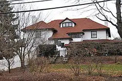Boit's three houses were all designed by local architect Harland Perkins. They were set in an estate compound on the summit of Cowdry's Hill that included three residences, formal gardens, a playhouse, and a greenhouse. All three residences, 90 and 88 Prospect Street, and 127 Chestnut Street (1910-1913), were designed in the English Cottage style. The stucco structures have red tile roofs, recessed entries, exposed purlins, and irregular fenestration. This house is 1+12 stories in height, with its entry set under a cross-gable roof section with a clipped gable. There are recessed porches on either side, supported by heavy columns.[3]