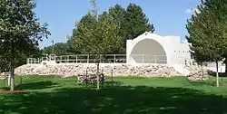 The park has a band shell and an oval amphitheater and a flagpole. It is laid out around a central fountain.[3]