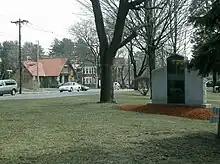The town of Hudson had two historic centers, though modern development and suburban sprawl have obscured the difference. Hudson Village, roughly equivalent to the Hudson census-designated place, is located at the western edge of town on the Merrimack River near the junctions of Routes 3A, 111, and 102, and was home to most of the original schools, libraries, and town government, though many of these functions have moved to new facilities elsewhere in town. The Town Hall still remains, though the main police station has moved to the eastern edge of town into an industrial park off Route 111. The Hills Memorial Library building remains as a historic landmark, though its collection has been moved to a new building, the Rodgers Memorial Library, located on Route 102 in the northeastern part of town.[8] The historic Kimball Webster School no longer holds classes, but today houses the town superintendent's office, though both the Library Street School and the H.O. Smith School are still active.[9] The Town Common at the intersection of Derry, Ferry, and Library streets is a park that displays large toy soldiers and other decorations at Christmas time.
