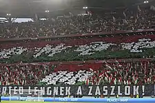 On 3 September 2015, one day before an UEFA Euro 2016 qualifying Group F match, Hungarian football hooligans clashed with the Hungarian police in the streets of Budapest, 16 of them being arrested.[15] Furthermore, the hotel which was hosting the Romanian team was assaulted by Hungarian hooligans.[16] Hours before the game, Hungarian fans attempted fights against the Romanian fans in the Romanian fanzone by throwing firecrackers and flares at them, but the Hungarian police forced stopped the two groups of fans from clashing.[17] Also before the game, a small group of Romanian fans supporting rival Romanian teams (Steaua Bucharest and Dinamo Bucharest) started to insult and beat each other in one of the stands. The Steaua fans responsible for the altercation (there was already tension between the Dinamo and Steaua fans due to Steaua fans deciding to wear their SUD Steaua shirts at the game instead of Romania shirts like the other over 1000 Romanian fans, the altercation started when Steaua fans misheard Dinamo fans' "Trianon" chant directed at the Hungarian fans as "Dinamo" and tried attacking them) were escorted out of the arena.[18][19][20] In return, the Hungarian fans chanted "cigányok" at the Romanian fans. The Romanian fans responded by chanting "bozgorii" at the Hungarian fans for much of the match. A few days before the match, there was a campaign by a section of Hungarians to show superiority during the rejection of the Romanian National Anthem, which was named "Ne fütyüld ki a román himnuszt!" (Which means: Do not whistle the Romanian Anthem!). However this did not happen. During the game, Hungarian fans booed Romania's national anthem with turning on their backs, showing obscene gestures, whistling all the time and lit flares and torches inside the stadium.[21] They also chanted xenophobic chants such as "cigányok" at the Romanian team and its fans for the remainder of the game, which finished 0–0.[22] After when the Romania's national anthem was booed by the Hungarian fans, during the intonatation of the Hungarian anthem, the Romanian fans turned on their backs, showed obscene gestures and shouted disgusting slogans against Hungary.