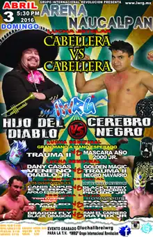 The IWRG Cabellera vs. Cabellera (April 2016) show (Spanish for "hair versus hair") was a professional wrestling supercard event produced by Mexican professional wrestling promotion International Wrestling Revolution Group (IWRG), and took place on April 3, 2016 in Arena Naucalpan, Naucalpan, State of Mexico, Mexico. The focal point of the Caballera vs. Caballera series of shows is one or more traditional Lucha de Apuestas, or "Bet matches", where all competitors in the match risk their hair on the outcome of the match. The Lucha de Apuestas is considered the most prestigious match type in lucha libre, especially when a wrestlers mask is on the line, but the "hair vs. hair" stipulation is held in almost as high regard.