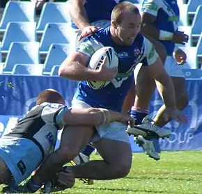 Henderson signed with the Bradford Bulls in 2005, where he made a massive impact in helping Bradford win the championship. He played for Bradford at hooker in their 2005 Super League Grand Final victory against the Leeds Rhinos. As Super League champions, Bradford played National Rugby League premiers Wests Tigers in the 2006 World Club Challenge. Henderson started at hooker in the Bulls' 30–10 victory. With the arrival of Terry Newton, Henderson found it hard to gain selection into the Bulls starting team. On 23 June 2007, the New Zealand Warriors announced they had signed Henderson for two years.[4][5] The Hendersons are a Scottish family and all three brothers have played for Scotland at international level.[6][7][8]