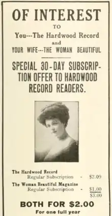 Advert for McGlone Gibson's The Woman Beautiful magazine in her husband's The Hardwood Record, April 1910