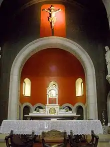 The exterior facade includes a combination of Romanesque and Baroque styles, featuring two towers with several bays and a porch. The building was inspired by Santa María del Naranco Cathedral and the sculptures of the Cámara Santa of the Oviedo Cathedral. The plan is in Latin cross style. It has a nave with a barrel vault and two aisles. In the transept stands a dome of Romanesque arches. There is a semicircular apse. Inside are the figures of Christ lying down and St Andrew.