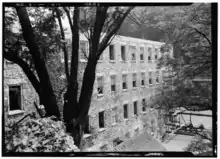 In 1761, John Cornthwaite founded a wood grist mill called the Dismal Mill, located approximately 2 miles (3 km) southeast of Ellicott City on the western shore of the Patapsco River.[4] The Ellicott family (John, Andrew, and Joseph Ellicott) settled in the area in the late 18th century, buying a two-mile section of the Patapsco in 1772 that included Ilchester and Ellicott Mills.[5] The Baltimore and Ohio Railroad (B&O) was built up the Patapsco River valley through Ilchester in 1830 (see Old Main Line Subdivision), and George Ellicott, Jr. (grandson of Andrew) built a tavern and cooper shop along the railroad.[6] The Thistle Manufacturing Company built a factory in 1837. Ilchester did not become a major stop for the B&O due to its steep grades, and the tavern was unsuccessful.[7] In 1842, mail service was started with the station name "Illchester Mills".