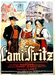 In Old Alsace (French title:L'ami Fritz) is a 1933 French drama film directed by Jacques de Baroncelli and starring Lucien Duboscq, Simone Bourday and Madeleine Guitty.[1] The film's sets were designed by the art director Jean d'Eaubonne. It is based on an 1864 novel by Alexandre Chatrian and Emile Erckmann.