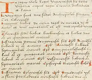 György Györffy cited the document as "the most precious statistical record of the country's relations at the end of the 12th century". Gyula Kristó claimed the register "overestimates the Hungarian king's income", which "is not suitable for drawing reliable conclusions either in terms of items or in relation to the ratio of the individual amounts".[3] Pál Engel argued that the "sum [166,000 marks] is incredibly large [...] and the document did not depict reality, [but] [...] can provide valuable information about the structure of the economy".[25] Economic historian Boglárka Weisz considered "the text of the income register was damaged or incomplete in several places during copying, but the outline of income types can be considered authentic".[1]