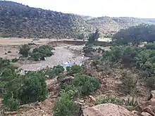 Evidence given by Italian aerial photographs of the catchment, taken in the 1930s show that 55% of the catchment was covered with woody vegetation (against 35% in 2014).[5] Up to the 1980s, there was strong pressure on the environment, and much vegetation disappeared.[6] This river had its greatest discharges and width in that period. The magnitude of floods in this river has however been decreased in recent years due to interventions in the catchment. At Addi Meles, Kidmi Gestet, May Hib'o, Gemgema, May Be'ati and on other steep slopes, exclosures have been established; the dense vegetation largely contributes to enhanced infiltration, less flooding and better baseflow.[7] Physical conservation structures such as stone bunds[8][9] and check dams also intercept runoff.[10][11]