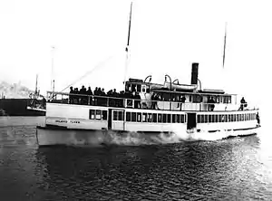 In 1903 Inland Flyer came under the control of the Puget Sound Navigation Company when that company merged with La Conner Trading.[5] Capt. Peter Falk (d.1924) one of the major shareholders of Puget Sound Navigation Co. served as one of masters of the Inland Flyer. Another captain was the veteran steamboat man William Mitchell (b. 1879).[3] On May 23, 1903, Inland Flyer was among the steamboats that greeted President Theodore Roosevelt when he toured the Seattle and the Bremerton naval yard.[6] In 1907 Inland Flyer was placed on the run from Seattle to Bremerton.[5]