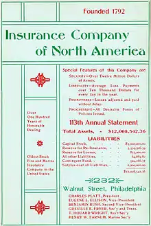 By the 1920s, INA had outgrown its Philadelphia home office at 232 Walnut Street and constructed a new 16-story office building far to the west of what was then Philadelphia's downtown.[25] The Insurance Company of North America Building, at 1600 Arch Street, opened in 1925 and was designated a National Historic Landmark in 1978.[26]