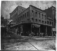 Construction of a new International Hotel began in May 1876, on the same site as the original buildings.[2] The hotel project, modeled after the Palace Hotel in San Francisco, was financed by owners Albert Hanak and Ike Bateman.[4] The six-story hotel stood 109 feet (33 m) high,[1] and was built at a cost of $600,000.[5] It opened as the tallest building in the state[6] on the night of March 31, 1877.[2][5] Attendees at the grand opening included businessmen James Graham Fair and John William Mackay, as well as U.S. Senator William Sharon and politician John Henry Kinkead.[5]
