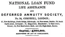 - ↑ Relevant dates in the company's early history are given in the transcript of its initial shareholders meeting, published at "National Loan Fund Life Assurance Society". The Athenæum. No. 656. May 23, 1840. pp. 422–423. An abridged version of the transcript appears at "National Loan Fund Life Assurance Society". The Spectator. No. 620. May 16, 1840. p. 478. The legislative history of the Act to enable the National Loan Fund Life Assurance Society ... appears in Volume 93 of the Journals of the House of Commons. It was enacted on July 25, 1838, as Local Act c. 92 of 1838 (1&2 Vict) and received royal assent on July 27. See page 752 of the Journals for the enactment and page 758 for the royal assent.