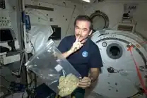 A photograph shows astronaut Chris Hadfield holding what looks like a bag of marijuana aboard the International Space Station.