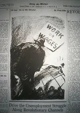 The Communist Party USA (CPUSA) prepared for the March 6 actions with agitational meetings and leaflets, over 1 million of which were circulated in anticipation of the event.[5] The party made use of two primary mobilizing slogans to motivate participation and to generate enthusiasm for the event: "Work or Wages!" and "Don't Starve – Fight!"[6] The demonstrations were to be conducted under the auspices of the party's trade union adjunct, the Trade Union Unity League (TUUL).[5]