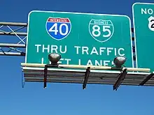 In May 2005, I-85 was redirected southeast around Greensboro along the Greensboro Urban Loop; its old routing through Greensboro became an extension of I-85 Bus, extending it from 29.8 miles (48.0 km) to 43 miles (69 km).[7][8] The extension included a hidden two-mile (3.2 km) concurrency along I-85 (between exits 118–120A) before splitting off again with US 29 and US 70. In merging onto I-40 (exit 219), it continued easterly before meeting back with I-85 (exit 227) near McLeansville. For a brief period in 2008, I-40 was also decommissioned through Greensboro and rerouted around the Urban Loop, with its old routing replaced by I-40 Bus, but its former in-town route was eventually restored, resulting once again in a regular and business Interstate sharing the same alignment. In October 2018, I-85 Bus was reverted to its original 29.8-mile (48.0 km) alignment, ending near Jamestown. The justification was to eliminate a redundant route and decrease the number of routing shields and overhead signs through Greensboro.[9][10]