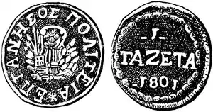 Illustration of a 1 gazeta coin, from the 1911 edition of the Century Dictionary (Lettering: ΕΠΤΑΝΗΣΟΣ ΠΟΛΙΤΕΙΑ = Septinsular Republic, ΓΑΖΕΤΑ = Gazeta