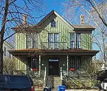 The Jay and Henry Knox House was built in 1860 by two brothers who were bankers. This is one of the few Carpenter Gothic houses in the Twin Cities. The vertical board and batten siding, a trademark of the style, was covered beneath stucco until its new owners began restoring the house in the 1970s.[2] |