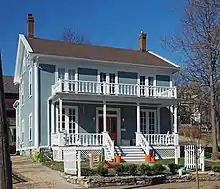 The William A. Spencer House at 47 Irvine Park was built 1856–1857 in a variant of pioneer Greek Revival architecture in which the roofline is parallel to the street. The two-story veranda is a later addition.[6] |