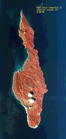Infrared image of Catalina showing the Isthmus of Catalina near the western end of the island (top of image). Two Harbors is on the northern (leeward) side.