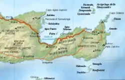 A number of archaeological sites are dotted around the isthmus. The bronze age site of Vasiliki(Βασιλική), in the middle of the isthmus, lends its name to an early form of Minoan pottery found primarily on the site.[1] Other Minoan sites in the vicinity are Gournia, Priniatikos Pyrgos and Chalasmenos (Χαλάσμένος). The Neolithic refuge site of Monastiraki Katalimata (Μοναστηράκι Καταλύματα) is located high up on the northern side of the Ha Gorge.