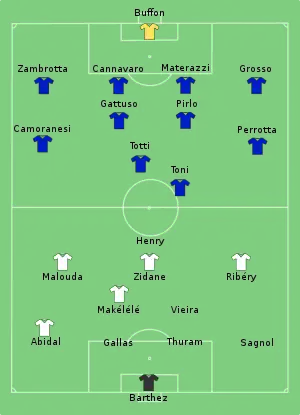 Italian defender Marco Materazzi was involved in all three outstanding moments of the first 120 minutes: He conceded the penalty that was converted by Zinedine Zidane early in the game, equalised with a powerful header soon after, and provoked Zidane in a manner that lead to the French captain being sent off. He also scored in the penalty-shootout that was to follow.
