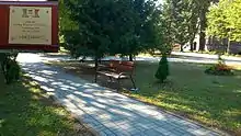 Plaque on bench memorising general in former barracks of Cavalry Training Center in Grudziądz
