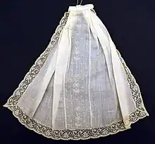 A jabot (/ʒæˈboʊ/ ⓘ; from French jabot 'a bird's crop') is a decorative clothing-accessory consisting of lace or other fabric falling from the throat, suspended from or attached to a neckband or collar, or simply pinned at the throat. Its current form evolved from the frilling or ruffles decorating the front of a shirt in the 19th century.[1]