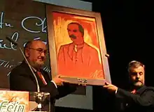 Jack O'Connor (right) is presented with a painting of James Connolly by Sinn Féin Dáil leader Caoimhghín Ó Caoláin to mark the 100th anniversary of SIPTU
