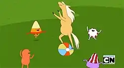 The titular character was named in honor of the animator, James Baxter,[4][5] who had once delivered a guest lecture at CalArts when Ward was a student. In the lecture, Baxter was showing students how to animate certain situations, and someone suggested that Baxter try animating a horse balancing on a beach ball. Baxter declined the suggestion, instead opting to animate something "simpler".[6] However, according to Adam Muto, the image of a horse and a beach ball fixed itself in Ward's mind.[5] Later, when Adventure Time was in production, Baxter called Ward to let him know that if the series needed any special animation work done, he would enjoy working on the show. Ward then met with Baxter and pitched him the initial idea behind "James Baxter the Horse"; Baxter himself thought the idea was "great", and was flattered that Ward wanted to name the eponymous character after him.[7]