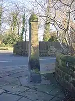 Sandstone signpost dated 1776, and inscribed with the initials of James Clemens. Situated at Thomas Lane and Thingwall Lane, the entrance to Clemen's house Ashfield (since burned down) can be seen behind the pillar.