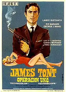 James Tont operazione U.N.O. or Operation Goldsinger is a 1965 French and Italian international co-production Eurospy film spoof based on James Bond's Goldfinger.[1] Co-written and co-directed by Bruno Corbucci and Giovanni Grimaldi, the film stars Lando Buzzanca as James Tont Agent 007 12 a parody of James Bond and Loris Gizzi as Erik Goldsinger, a parody of Auric Goldfinger. It was followed by James Tont operazione D.U.E..