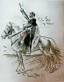 According to the Polish chronicler Jan Długosz,[15] in the following year (1410) Žižka served as a mercenary during the Polish–Lithuanian–Teutonic War. It is assumed that he was on the winning Polish-Lithuanian side of the Battle of Grunwald, also called the 1st Battle of Tannenberg, one of the largest battles in Medieval Europe.[16][17] It was fought on 15 July 1410, and the alliance of the Kingdom of Poland and the Grand Duchy of Lithuania, led respectively by King of Poland Jogaila (Władysław II Jagiełło) and Grand Duke Vytautas (Witold), decisively defeated the Teutonic Knights, led by Grand Master Ulrich von Jungingen. Most of the Teutonic Knights' leadership were killed or taken prisoner. The Knights never recovered their former power and the financial burden of war reparations caused internal conflicts and an economic downturn in their lands. The battle shifted the balance of power in Eastern Europe. Długosz reports that after the battle, Žižka was serving in the garrison of the town of Radzyń.