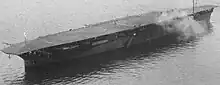 After the modifications, Hōshō continued to provide training to navy pilots in the Inland Sea, including acting as a target ship for torpedo training.[19] At 05:30 on 19 March 1945, possibly while berthed at Kure, the carrier was caught in an air raid by carrier aircraft from the United States Task Force 58. Hōshō's flight deck was damaged by three bomb hits which killed six crewmen. Emergency repairs were made and her captain was ordered to keep her in readiness on 10 April. However, this order was revoked two days later and the carrier became a "4th reserve ship" with most of her crew transferred elsewhere. Hōshō was taken out of reserve as a "special guard ship" on 1 June and many of her crew were transferred back. During this time, the ship remained moored and camouflaged off Nishinomishima at Kure.[14][19][Note 4]