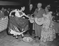 Jarabe Tapatío, often referred to as the Mexican hat dance, is the national dance of Mexico.[1] It originated as a courtship dance in Guadalajara, Jalisco, during the 19th century, although its elements can be traced back to the Spanish zambra and jarabe gitano, which were popular during the times of the viceroyalty.[2] Female dancers traditionally wear a china poblana outfit, while the male dancers dress as charros, and their steps are characterized by flirtatiously stepping around the brim of their partner's hat. [3][4]