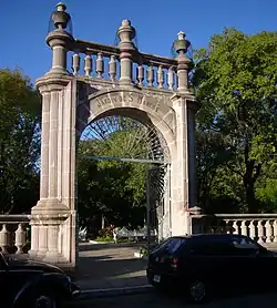 The construction of the balustrade began in 1842, promoted by the Governor of Aguascalientes Nicolás Condell and the magnum opus would end in 1842.[1] The balustrade is neoclassical in pink quarry, with four entrances, one on each side of the garden, facing the four cardinal points.