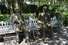 Bench with two sculptures "sitting" on it in the Jardin de San Marcos