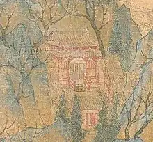 Court patronage for jiehua peaked in the Northern Song period, resulting in the creation of some of the greatest jiehua masterpieces of all time, such as Along the River During Qingming Festival 《清明上河图》.[28] Historian Wen Chien-Cheng suggests that the renaissance of jiehua painting in the Northern Song Dynasty may be attributed to the rising prominence of landscape paintings and appreciation of realism.[28][29] The surviving jiehua works from the Southern Song period typically portray close-ups of structures which were “often juxtaposed with voids that suggest distance and atmospheric mood," an adoption of Southern literati landscape features.[30]