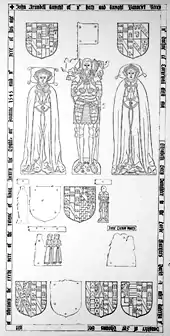 His splendid and originally richly enamelled[20] monumental brass survives in the parish church of St Columb Major. It is in a fairly complete state, and shows Sir John bare-headed but otherwise in full armour, between his two wives dressed in gowns, mantles, and pedimental headdresses. Below them are two smaller male figures, one partly perfect in armour, and underneath again, six female children, of whom two remain.[21][22] The brasses are firmly fixed to the original slab of grey marble by apparently the original fastenings.[23] They were originally in the Arundell chapel (a chantry built by the Arundells on the south side of the chancel of the parish church), and were early in the 19th century covered with some pews which were then placed in the chapel.[24] On the restoration of the church later that century, the chapel being re-pewed, they were removed to their present position, which is an unfortunate selection, as it subjects them to a large amount of wear from the feet of persons passing over them, they being on the floor of the nave immediately below the chancel steps.[25] The slab is now the southernmost of two and measures 7 feet 4 inches by 3 feet 9 inches; around it, 3 inches from the edge, is a plain fillet of brass bearing this inscription, partly missing, on a ledger-line:[26]