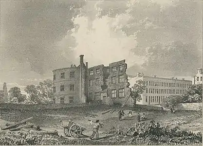 John Chubb's topographical work shows Bridgwater streets and buildings, and his portraits are of his family and local worthies. A number of the paintings feature pretty girls in ornate hats.[24] His portraits of tradesmen and craftsmen include their tools, rather like the Books of Trades of earlier centuries. There are more portraits than topographical paintings. Some time in the early C19 lithographic prints were made of about a dozen of his paintings of Bridgwater scenes, and these are fully represented in the Museum's collection. They were probably by his grandson, John Chubb the younger, also a talented artist. A letter (in the Chubb MS in the Somerset Record Office) which he wrote to his father, Morley, in 1835, mentions him having drawings reproduced as prints by Charles Joseph Hullmandel, the foremost lithographic printer of the time.