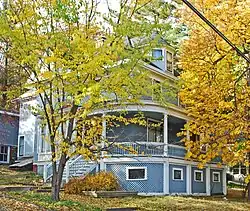The John Michels House is an asymmetrical, 2+1⁄2-story Queen Anne-style house with a gable and hipped roof.[2] The exterior was originally lapsided with wood siding, but is now covered with cedar shingles. A gabled pediment and conical tower delineate the roofline, and the house is roofed in asphalt shingles. A circular porch wraps around the first story, supported by round wooden columns and accented with beaded spindle work.[2]