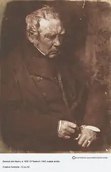 John Munro came home on leave in 1819, when he bought Teaninich Castle from his brother Hugh.[18] He returned briefly to India in 1823–4, before ill-health compelled his retirement. As an evangelical Christian, he supported the Great Disruption of 1843. His calotype portrait by David Octavius Hill was the model for his inclusion in the Hill's famous painting of the signing of the Deed of Separation at the First Assembly of the Free Church of Scotland. He provided land for the Free Church in Alness, of which he became an elder. On Hugh's death in 1846, he inherited the Teaninich distillery which the latter had founded in 1817.