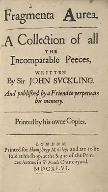 A collection of Suckling's poems first appeared in 1646 as Fragmenta Aurea. The Selections (1836) published by Alfred Inigo Suckling is in fact a complete edition, of which WC Hazlitt's edition (1874; revised 1892) is little more than a reprint with some additions. The Poems and Songs of Sir John Suckling, edited by John Gray and decorated with woodcut border and initials by Charles Ricketts, was artistically printed at the Ballantyne Press in 1896. In 1910 Suckling's works in prose and verse were edited by A. Hamilton Thompson.[10]