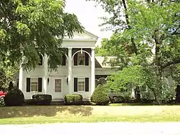 Built in 1863 in the style of Greek Revival architecture, the structure is a wood framed, two-story house with a portico, pediment, and rounded latticework linking the four hexagonal columns of the portico. A 1½-story addition was built along the entire right side of the house in 1880, extending the length of the structure and adding a large room. Since then, the structure has remained largely intact, except for an arcade and porch added to the back in 1974.[2] The house is clad with Flush-board siding, and has a center door with molded enframement. A recessed porch on the ell contains a secondary entrance door.[3]