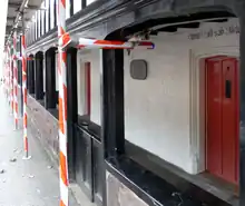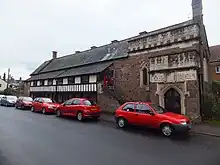 The Almshouse was built in open fields on the outskirts of the town of Tiverton, near the "Wellbrook" stream.[14] The town has since greatly expanded to surround the site, and "Wellbrook Street" now runs past the Almshouses. A large modern complex of charitable housing was built in the 20th century to the rear of the Almshouses by the "Tiverton Almshouse Trust".[14] The two-storey Almshouse occupies the eastern part of the building and was designed for 8 "poor, impotent and indigent"[14] men of Tiverton, each occupying a single room.[15] The upper floor is reached by an external staircase leading to a covered gallery landing. In 1847 they were in "a most dilapidated state", as described by Harding in his History of Tiverton.[16] They were restored in 1987,[15] as is recorded on a plaque inscribed: