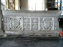 Chest tomb of John Waldron, St Peter's Church, Tiverton, showing his merchant's mark and the date "1579". On the lower level are shown the initials "RW" for his wife Richord