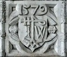 Merchant's mark of John Waldron, between the initials "JW", shown on an heraldic escutcheon beneath the date "1579", within a quatrefoil between Gothic pinnacles, detail from his chest tomb in St Peter's Church, Tiverton